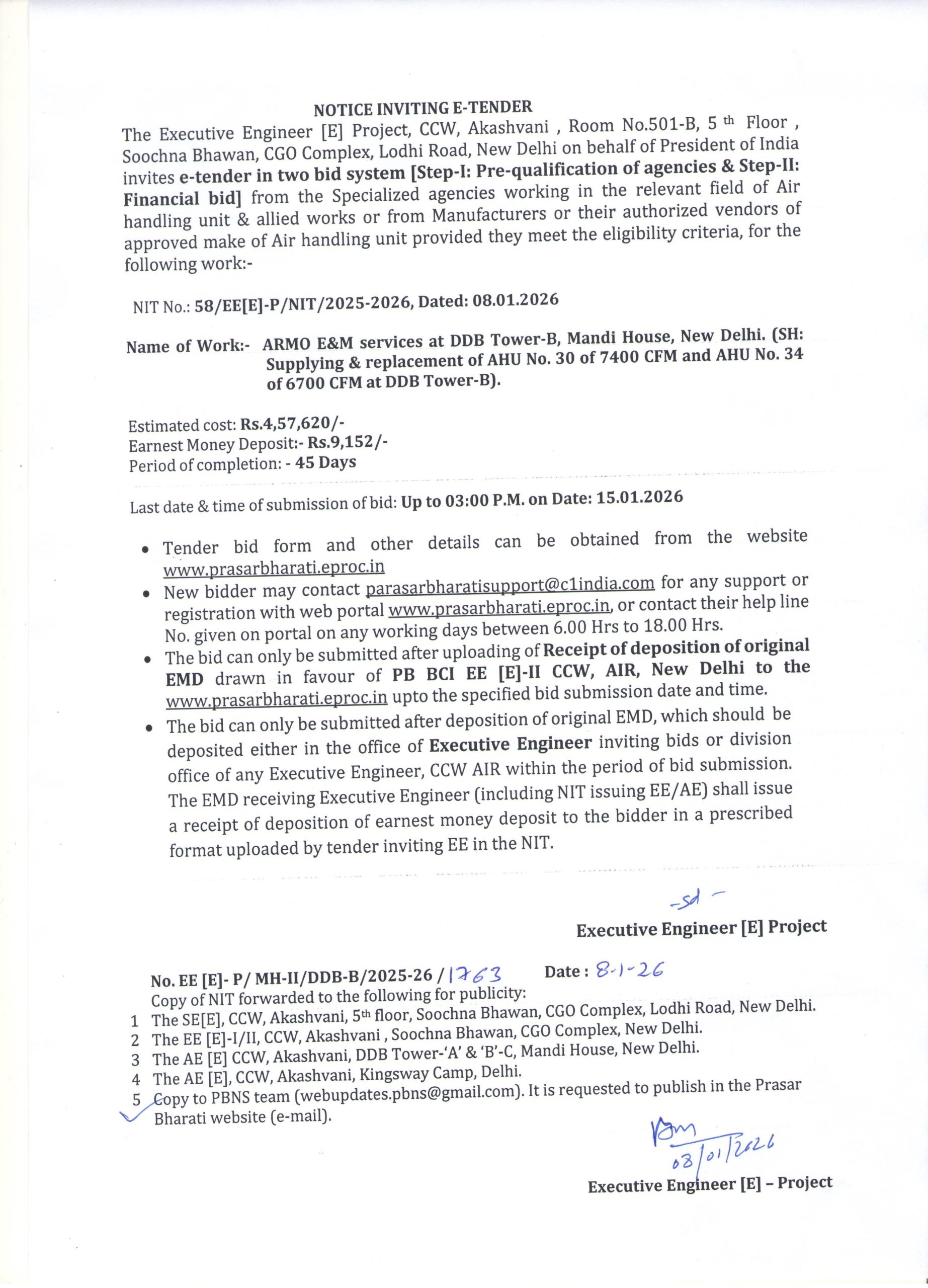 | Award Letter of NIT No. 012/EDM/MUM-II/2024-25 MOEI Fans & RMO pump sets at Broadcasting House, Mumbai for the year 2024-25. (Sub Head: Annual Non comprehensive maintenance of internal electrical installations including operation of water supply pump sets). |